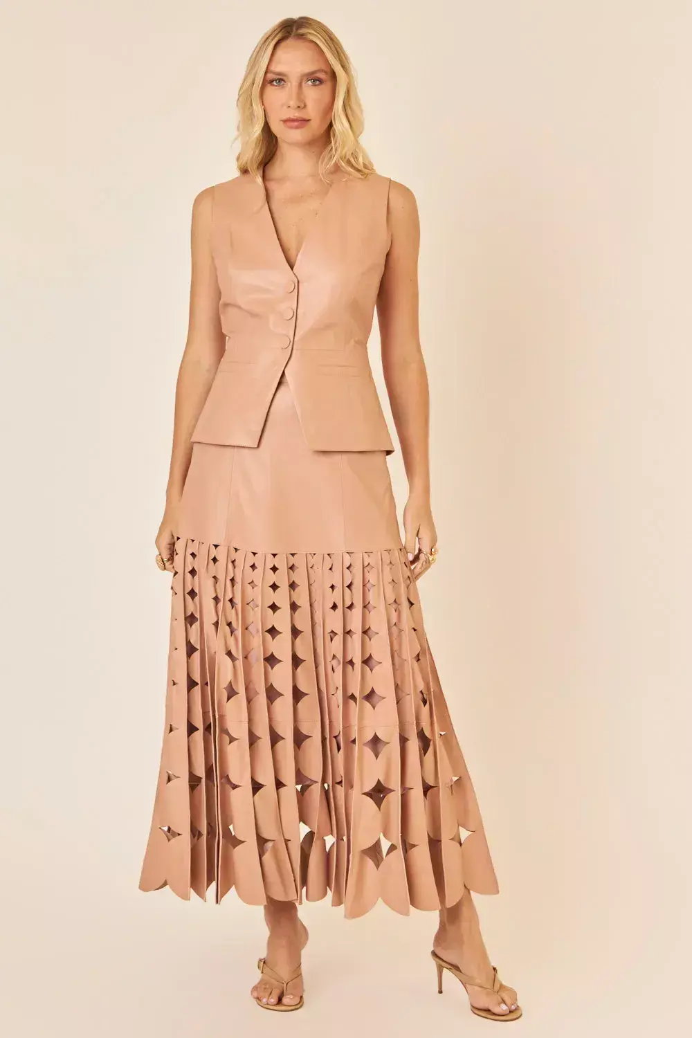 A blusa Giulia confeccionada em couro new nobre 100% traduz modernidade e sofisticação em uma peça versátil. Seu design estruturado valoriza a silhueta, com decote em V elegante e fechamento frontal por botões revestidos, que reforçam o ar refinado da peça. O tom nude confere neutralidade, permitindo combinações fáceis e sofisticadas, seja com saias, calças de alfaiataria ou o short da mesma família. Um item atemporal que traz a imponência do couro em uma modelagem feminina e elegante.
