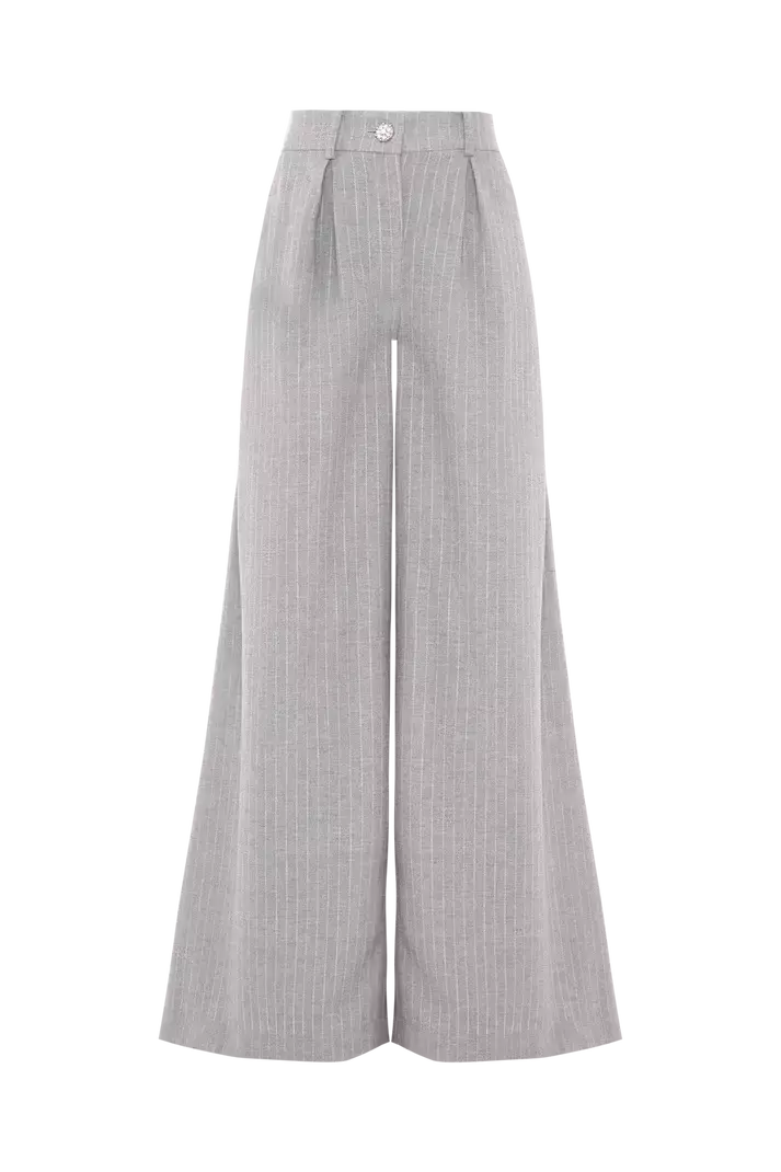 Calça em alfaiataria cinza com padronagem risca de giz. A peça une estrutura e sofisticação com um toque de brilho sutil. Estrutura ampla e caimento sofisticado.