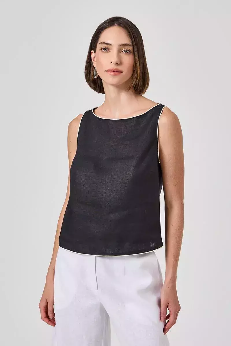 A regata box preta em linho é a síntese do minimalismo elegante. o corte reto e a modelagem ampla garantem conforto e sofisticação, enquanto os vivos em tom claro criam um contraste sutil que valoriza o design da peça. o decote mais fechado e as cavas ajustadas conferem um caimento refinado e versátil.
