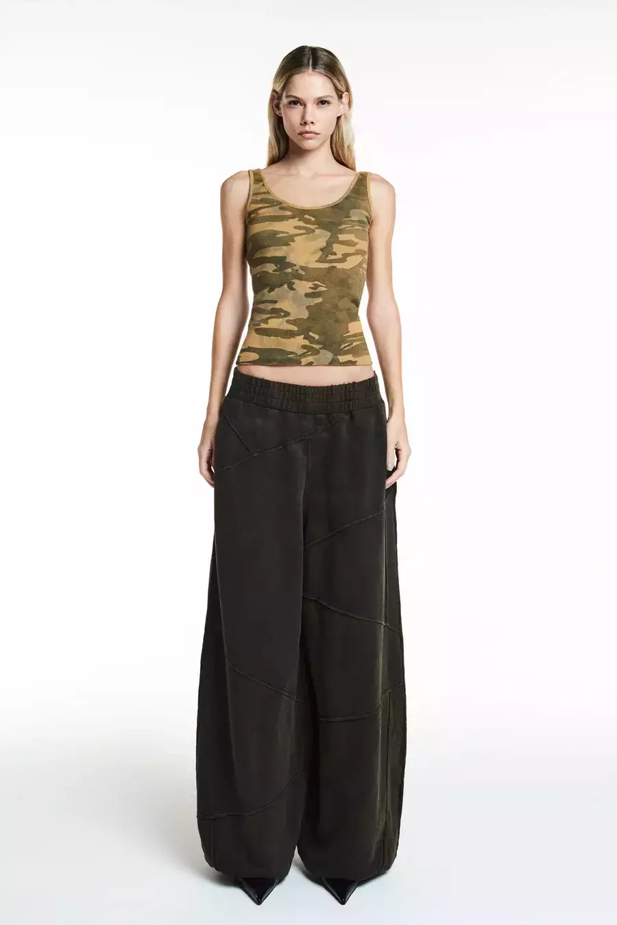 Regata em malha canelada com elasticidade com estampa militar e modelagem ajustada ao corpo e alças largas.  Decote redondo profundo. Não possui fechamento.