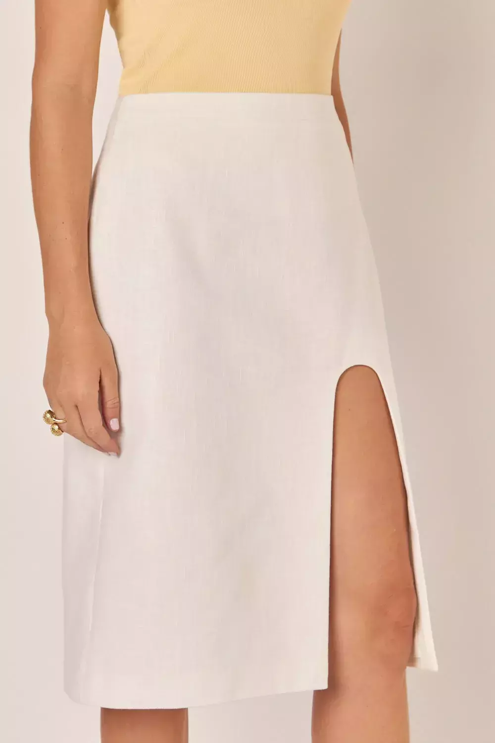 Saia midi Izabel confeccionada em tecido misto de aspecto rústico, que proporciona estrutura a peça. A modelagem reta valoriza a silhueta com elegância e sofisticação, enquanto a fenda frontal assimétrica adiciona movimento e um toque de ousadia sutil. O design limpo e minimalista torna a peça extremamente versátil. Ideal para compor produções refinadas, do ambiente profissional a ocasiões mais formais com elegância contemporânea.