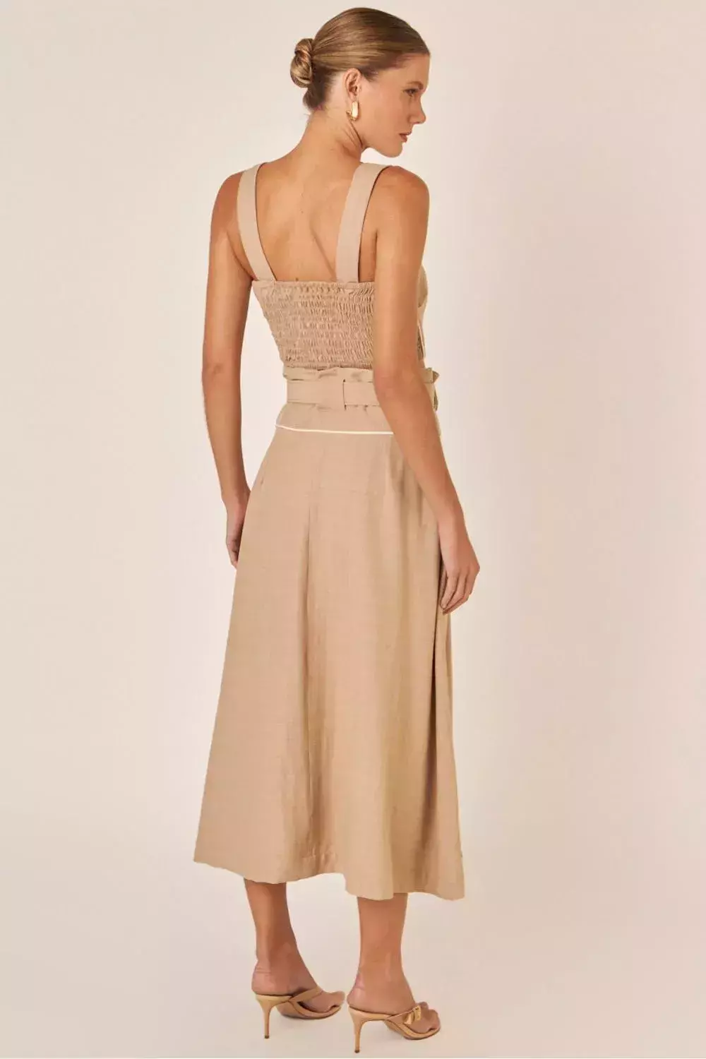 Saia midi Pauline feita em tecido leve com textura suave. Possui cintura alta marcada por cinto forrado com fivela e detalhe de vivo contrastante que destaca o design. O modelo apresenta pregas frontais que proporcionam volume elegante e caimento fluido, além de comprimento abaixo do joelho, trazendo sofisticação ao visual. Versátil, pode ser combinada com tops ajustados ou camisas soltas, sendo ideal tanto para produções casuais quanto para ocasiões mais sofisticadas.