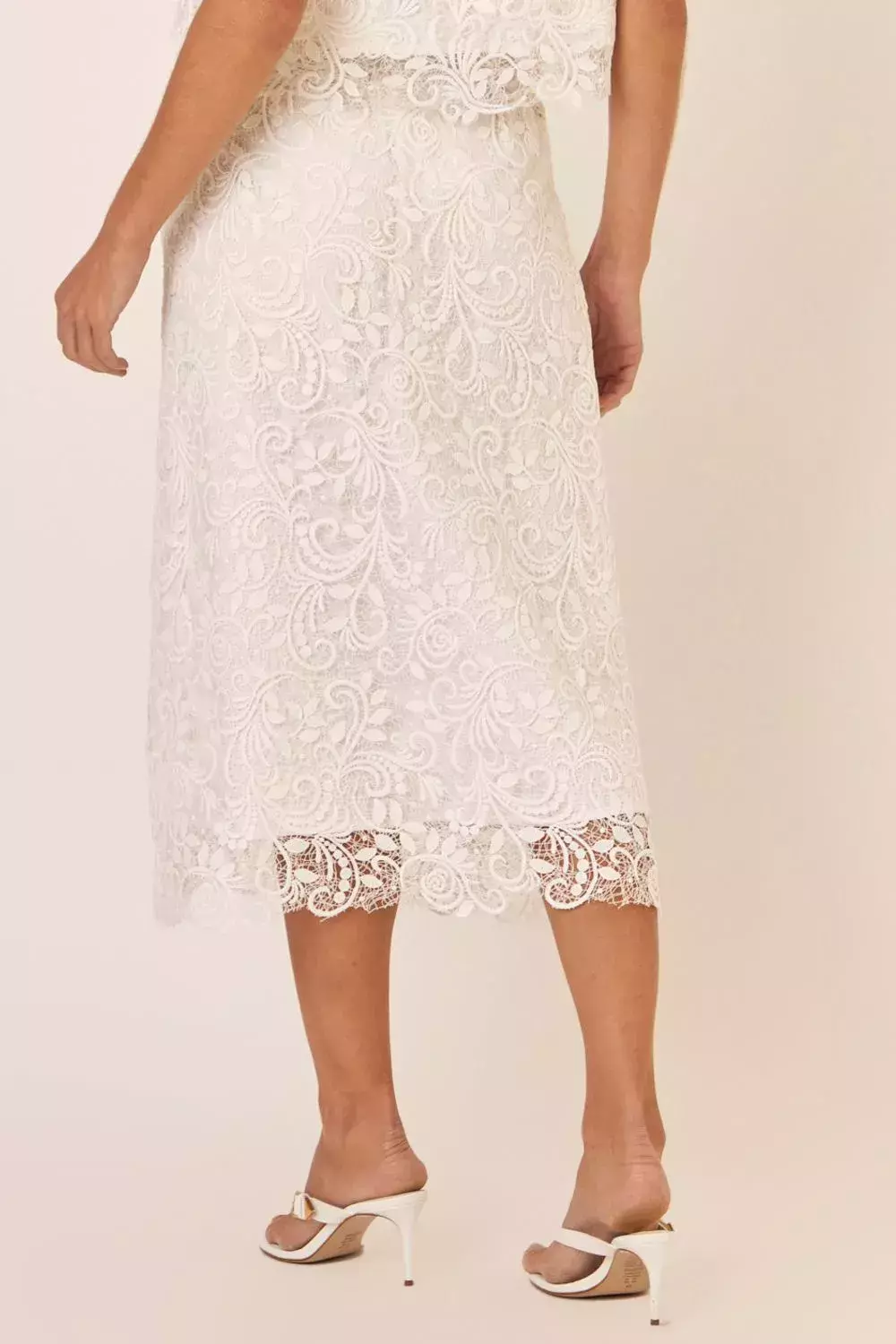 Saia midi Samara confeccionada em delicado guipir com desenho ornamental, que traz elegância e textura rica à peça. Possui modelagem reta levemente acinturada e caimento fluido, valorizando a silhueta de forma sofisticada. O cós liso garante um acabamento limpo, enquanto a barra apresenta recorte acompanhando o desenho do guipir, proporcionando um toque artesanal e charmoso. Fechamento posterior por zíper invisível, assegurando praticidade e um visual impecável. Ideal para composições coordenadas ou produções sofisticadas para eventos especiais.