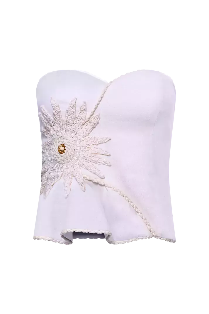 Leve e sofisticado, este top tomara que caia se destaca pela barra assimétrica e pela aplicação de flor em crochê, enriquecida por detalhes em miçangas. A peça é finalizada com entremeios delicados que valorizam suas linhas esculturais. Complete o look com a calça coordenada para um conjunto cheio de charme e personalidade que não passa despercebido.