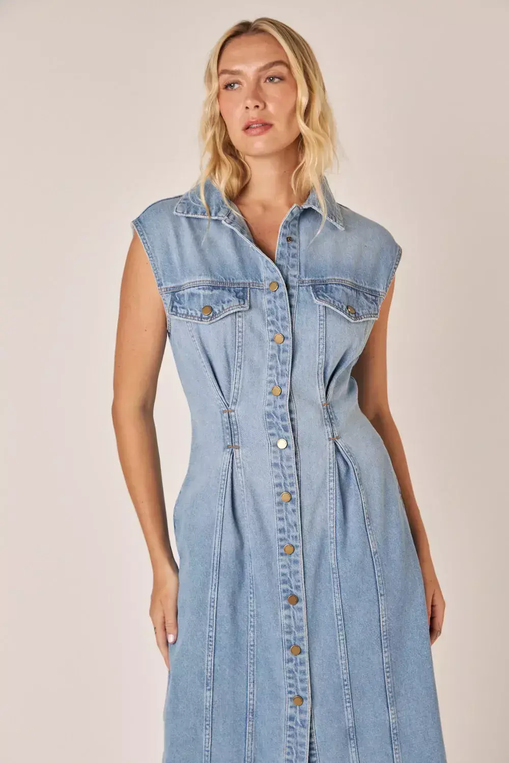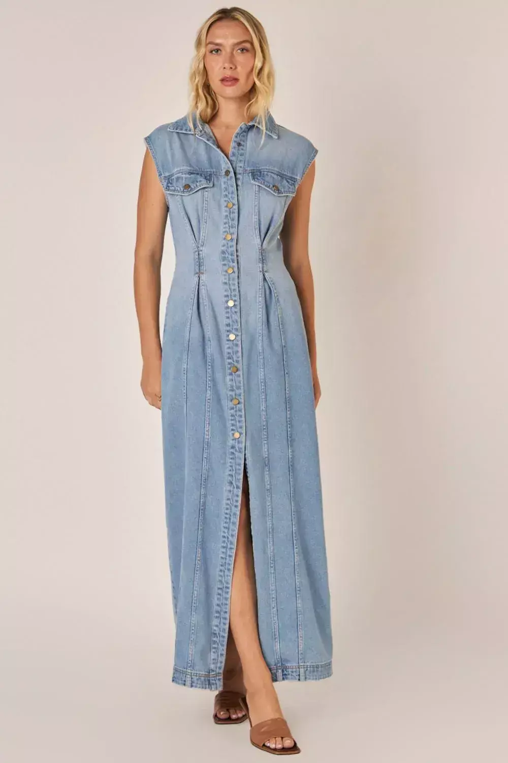 O vestido Diana, tem modelagem reta, comprimento longo e possui gola estilo camisa, fechamento frontal por botões metálicos e fenda na barra, que traz movimento e um toque moderno ao look. Os recortes verticais alongam a peça visualmente, enquanto o design sem mangas com ombros levemente marcados adiciona atitude e versatilidade. A lavagem jeans clara é fácil de combinar e funciona bem tanto em produções casuais quanto em composições mais arrumadas. Use com rasteiras, tênis ou salto — e transforme o look apenas trocando os acessórios.