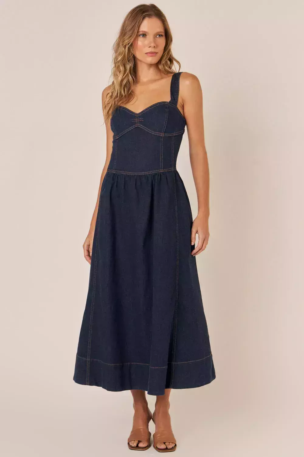 O Vestido Lívia combina feminilidade e elegância com o charme do jeans. Com modelagem acinturada Possui alças largas, decote estruturado com recorte no busto e detalhes pespontados que destacam o design. O fechamento nas costas é feito por zíper, garantindo praticidade e um visual limpo na parte frontal. Seu comprimento midi traz sofisticação na medida certa, ideal para composições que vão do casual ao elegante. Use com sandálias, rasteiras ou saltos para diferentes ocasiões.