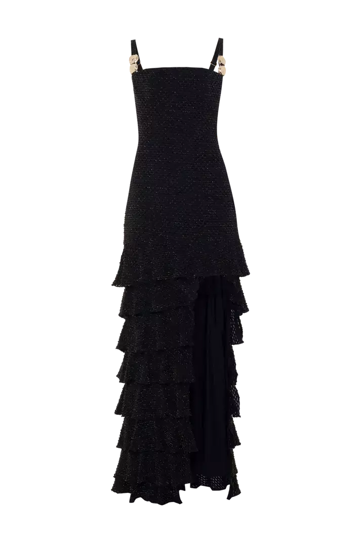 O vestido longo malha gavea exala elegância com um toque de sensualidade. De silhueta justa e sofisticada em malha texturizada com lurex, ele conta com alças finas adornadas por metais dourados que trazem um ar de glamour. O grande destaque fica por conta da saia com babados em cascata, que se abre em uma fenda frontal ousada na medida certa, revelando as pernas com charme.