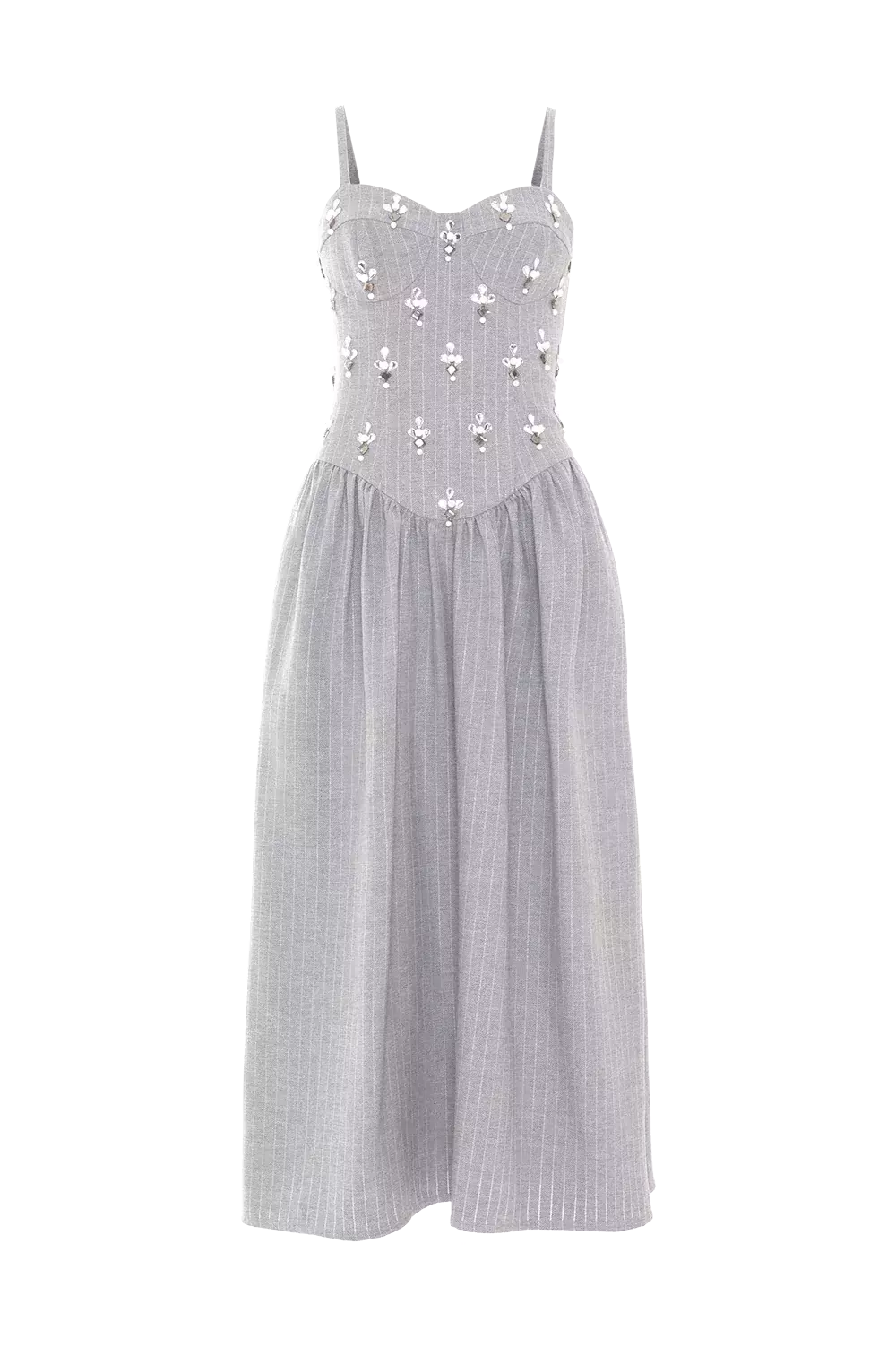 Este vestido une a força da alfaiataria à delicadeza do feito à mão. Com busto estruturado em shape de corset e recorte princesa, ele valoriza a silhueta feminina com sofisticação. O corpo em risca de giz recebe aplicações manuais de cristais e pedrarias, que formam pequenos arranjos florais brilhantes, criando um contraste elegante entre o tailoring e o toque artesanal. A saia ampla com caimento fluido equilibra o look com leveza.